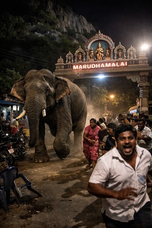 கோவை அருகே உள்ள மருதமலையில் அருள்மிகு முருகன் கோவில் உள்ளது.இந்த கோவிலுக்கு தமிழ்நாடு மற்றும் பிற மாநிலங்களில் இருந்து தினமும் ஏராளமான பக்தர்கள் வந்து செல்கின்றனர். சமீப காலமாக மருதமலை பகுதியில் காட்டு யானைகள் நடமாட்டம் இருந்து வருகிறது .நேற்று முன்தினம் நள்ளிரவில் காட்டு யானை ஒன்று மருதமலை முருகன் கோவில் அடிவார பகுதியில் புகுந்தது. பஸ் நிலையம் உள்ளிட்ட இடங்களில் அந்த யானை உலா வந்தது. இதை பார்த்து கடை நடத்தி வரும் வியாபாரிகள் பொதுமக்கள் அலறி அடித்துக் கொண்டு பாதுகாப்பான இடங்களை நோக்கி ஓடினர் .இதனால் பரபரப்பு ஏற்பட்டது. இது குறித்து வனத்துறையினருக்கு தகவல் கொடுக்கப்பட்டது. அவர்கள் விரைந்து வந்து யானையை காட்டுக்குள் விரட்டினார்கள். இதுதொடர்பான வீடியோ காட்சிகளை சிலர் சமூக வலைதளங்களில் பதிவிட்டுள்ளனர் . அது தற்போது வைரலாக பரவி வருகிறது. மருதமலை முருகன் கோவில் அடி வார பகுதியில் காட்டு யானைகள் நடமாட்டம் தொடர்ந்து வருவது பக்தர்களை அதிர்ச்சிக்கு உள்ளாக்கி இருக்கிறது..