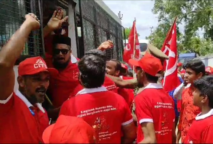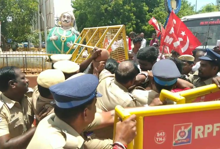 தஞ்சையில் ரயில் மறியல் போராட்டத்தில் ஈடுபட முயன்ற சிபிஎம் கட்சியினரை காவல் துறையினர் தடுத்ததால் இருவருக்கும் இடையே தள்ளுமுள்ளு ஏற்பட்டது. காவல்துறையினர் தடுப்புகளை தாண்டி ரயில் நிலையத்திற்குள் நுழைய ஓடிய பெண்களை காவல்துறையினர் துரத்தி சென்றனர். ரயில் நிலையத்திற்குள் நுழைந்த போராட்டக்காரர்கள் தண்டவாளத்தில் அமர்ந்து மறியலில் ஈடுப்பட்டதால் பரபரப்பு ஏற்பட்டது. விலைவாசி உயர்வுக்கும், வேலை வாய்ப்பின்மைக்கும் ...
