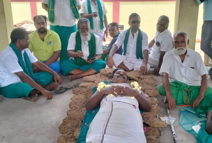 திருச்சி ஓயாமெரி சுடுகாட்டில் தேசிய தென்னிந்திய நதிகள் இணைப்பு விவசாயிகள் சங்க மாநிலத் தலைவர் அய்யாக்கண்ணு தலைமையிலான விவசாயிகள் பிணமாக படுத்து போராட்டம். விவசாய விளைபொருட்களுக்கு இரண்டு மடங்கு இலாபகரமான விலை தருவதாக கூறிவிட்டு தராமல் ஏமாற்றியதை நிறைவேற்ற கோரியும் விவசாயிகள் வாங்கிய அனைத்து கடன்களையும் தள்ளுபடி செய்ய கோரியும் கோதாவரி-காவிரி இணைப்பு திட்டத்தை நிறைவேற்ற ...