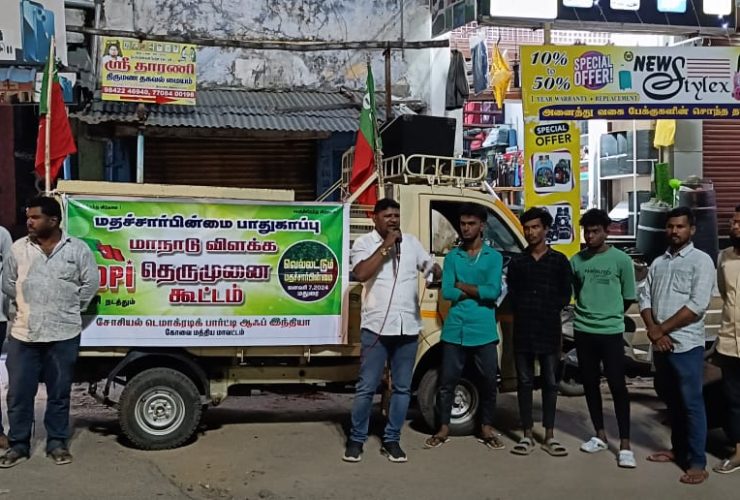 SDPI கட்சியின் சார்பில் ஜனவரி 7ஆம் தேதி மதுரையில் நடைபெறும் வெல்லட்டும் மதச்சார்பின்மை என்னும் தலைப்பில் மதசார்பின்மை பாதுகாப்பு மாநாட்டு நடைபெற இருக்கின்றது அம் மாநாட்டின் விளக்க தெருமுனை கூட்டம் சூலூர் கலங்கள் நால்ரோடு சந்திப்பில் நடைபெற்றது இந்நிகழ்ச்சியில்சூலூர் தொகுதி தலைவர் பைசல், மாநாட்டு விளக்கவுரை செயற்குழு உறுப்பினர் பஷீர் கிணத்துக்கடவு தொகுதி செயலாளர் ஷேக்பரீத் ...