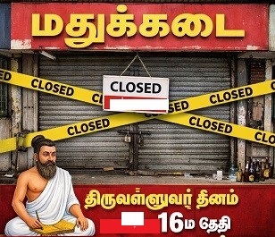 கோவை மாவட்ட கலெக்டர் பவன் குமார் வெளியிட்டுள்ள செய்தி குறிப்பில் கூறியிருப்பதாவது:- கோவை மாவட்டத்தில் உள்ள அனைத்து டாஸ்மாக் மதுபான கடைகள் மற்றும் பார்கள் மன மகிழ் மன்றங்களில் செயல்படும் மது கூடங்கள், நட்சத்திர ஓட்டல்கள் ,தமிழ்நாடு ஓட்டல்களில் செயல்படும் மது கூடங்கள், பொழுதுபோக்கு மன்றங்களில் செயல்படும் மதுக்கூடங்கள், சுற்றுலாத்துறை மதுக்கூடங்கள் மற்றும் இறக்குமதி செய்யப்பட்ட அயல்நாட்டு மதுபானங்கள் விற்பனை செய்யும் மதுக்கூடங்கள் என அனைத்து மதுபான விற்பனைக் கூடங்களையும் திருவள்ளுவர் தினமான வருகிற 16-ம் தேதி (வியாழன்) அன்று மூட உத்தரவிடப்படுகிறது. அன்றைய தினம் விதிமுறைகளுக்கு முரணாக மதுபானங்கள் விற்பனை செய்பவர்கள் மீதும், சட்ட விரோதமாக பதுக்கி வைப்பவர்கள் மீதும் தமிழ்நாடு மதுவிலக்கு சட்டம் 1937 -ன் படி நடவடிக்கை மேற்கொள்ளப்படும். இவ்வாறு அதில் கூறப்பட்டுள்ளது..