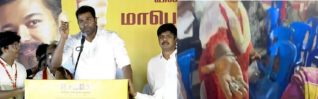 வில்லிவாக்கத்தில் நடைபெற்ற இந்தப் பொதுக்கூட்டத்தில் த.வெ.க பரப்புரைச் செயலாளர் நாஞ்சில் சம்பத், வேட்பாளர் ஆதவ் அர்ஜுனாவை ஆதரித்து உரையாற்றிக் கொண்டிருந்தார். அப்போது, கூட்டத்தில் இருந்த பெண்கள் மீது மர்ம நபர்கள் கண்ணாடி பாட்டில்களை உடைத்து, அதன் துண்டுகளை கொண்டு வீசித் தாக்குதல் நடத்தினர். இதுகுறித்த தகவல் மேடையில் இருந்த ஆதவ் அர்ஜுனாவிடம் தெரிவிக்கப்பட்டது. தகவல் அறிந்ததும் நாஞ்சில் சம்பத்தின் பேச்சை இடைமறித்து மைக் பிடித்த ஆதவ் அர்ஜுனா ஆவேசமாக உரையாற்றினார்.