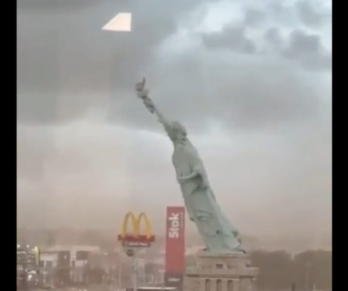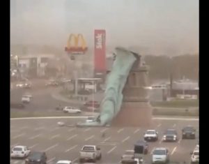 90 கிலோ மீட்டர் வேகத்தில் வீசிய புயல் காற்றில், சுதந்திர தேவி சிலை சரிந்து விழுந்து நொறுங்கியது.