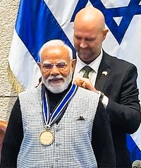 இந்த நிலையில், இஸ்ரேல் நாடாளுமன்றத்தில் பிரதமர் நரேந்திர மோடிக்கு அந்நாட்டு சபாநாயகர் உயரிய விருதை அளித்து கவுரவித்துள்ளார். இஸ்ரேல் நாடாளுமன்றமான ‘கினசெட்’ (Knesset), பிரதமர் நரேந்திர மோடிக்கு தனது உயரிய கௌரவமான ‘Speaker of the Knesset Medal’-ஐ வழங்கிச் சிறப்பித்துள்ளது. இந்த பதக்கத்தைப் பெறும் முதல் நபர் பிரதமர் நரேந்திர மோடி ஆவார்.