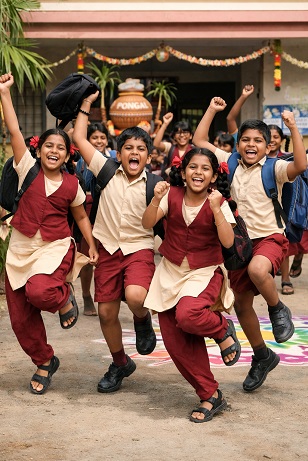 தமிழக அரசின் அதிகாரப்பூர்வ அறிவிப்பின்படி, ஜனவரி 14-ஆம் தேதி (புதன்கிழமை) போகி பண்டிகை முதல் ஜனவரி 18-ஆம் தேதி (ஞாயிற்றுக்கிழமை) வரை பள்ளிகள் இயங்காது. இதனால் பொங்கல் விடுமுறை 5 நாட்களாக நீட்டிக்கப்பட்டுள்ளது. இடையில் வரும் சனி மற்றும் ஞாயிற்றுக்கிழமைகளும் விடுமுறை தினங்கள் என்பதால், பொங்கல் பண்டிகை ஒரு நீண்ட வார இறுதி விடுமுறையாக (Long Weekend) அமைந்துள்ளது.